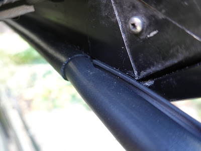 This spring I did notice that the seals in the back corners were showing signs of wear, so I have been giving them a little extra attention. After arriving home from Rock Lake, the door side corner of the seal was completely gone, and the service side had a large hole right through. I blame this on the rough washboard road heading into that campground, and the constant shifting and vibration the roof would have been enduring.
